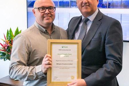 BAM Construction Ltd have awarded Billington Structures ‘Regional Contractor of the Year’ at their Annual Supply Chain Awards 2017. This Gold certificate of recognition was awarded to Billington at the annual event, hosted on 3<sup>rd</sup>May at BAM offices at Salford Quays. Billington have most recently